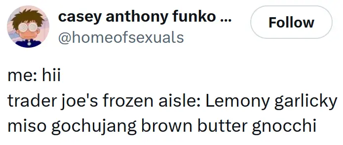 “Trader joe’s frozen asile: Lemony garlicky miso gochujang brown butter gnocchi.”